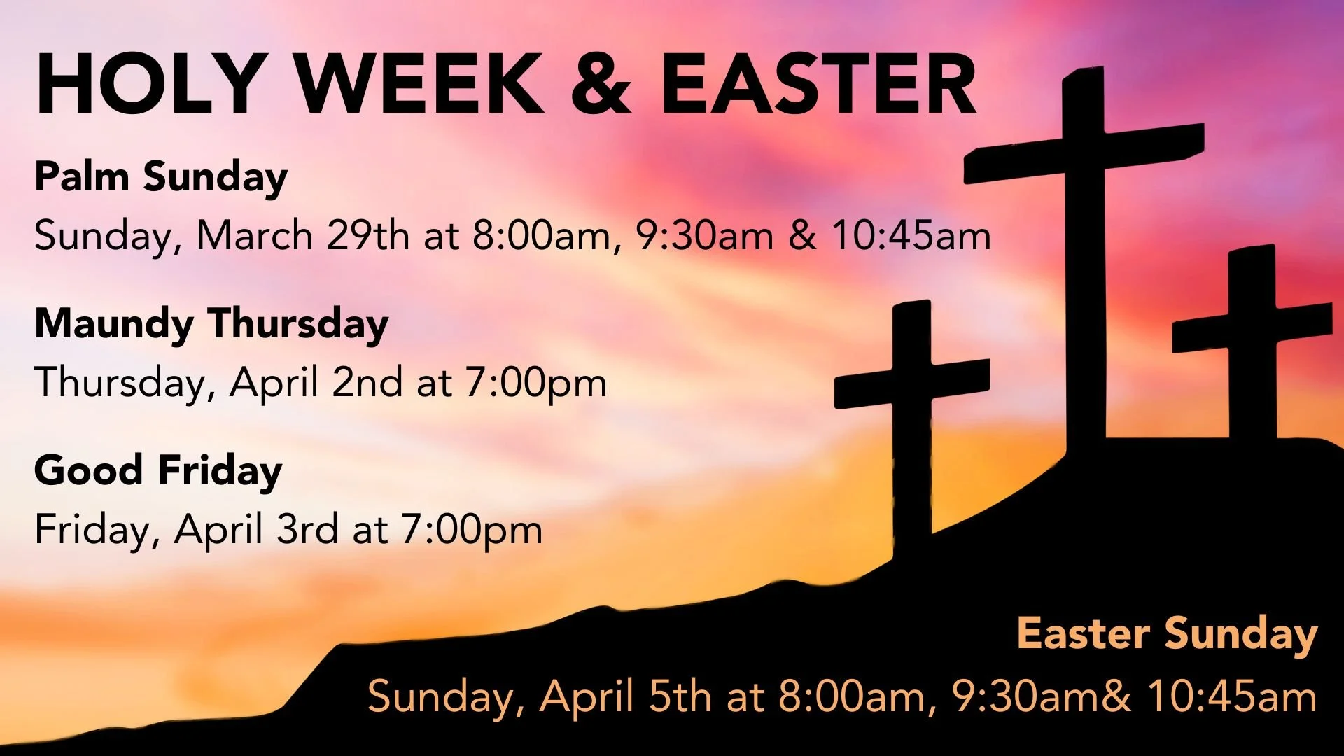 Back to All Events Holy Week 2026 Sunday, March 29, 2026 8:00 AM Sunday, April 5, 2026 12:00 PM Atonement Lutheran Church S70W16244 Martin Drive Muskego, WI, 53150 United States (map) Google Calendar ICS