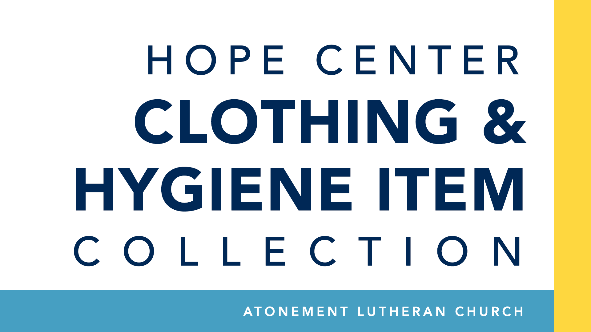 The Hope Center in Waukesha runs a clothing store which provides clothing and personal items at no cost to those in need. This spring, Atonement is collecting clothing and personal hygiene products to donate to the Hope Center.